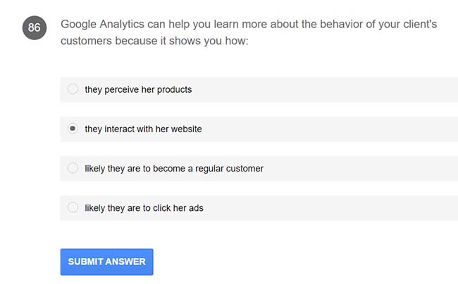 86. Google Analytics can help you learn more about the behavior of your client’s customers because it shows you how: