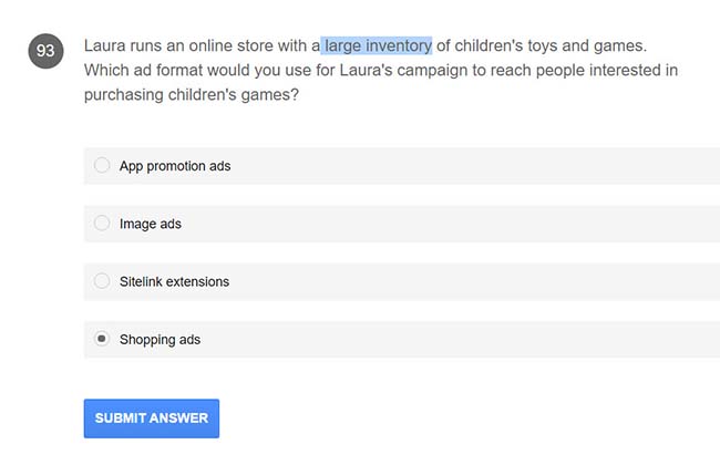 93. Laura runs an online store with a large inventory of children’s toys and games. Which ad format would you use for Laura’s campaign to reach people interested in purchasing children’s games?